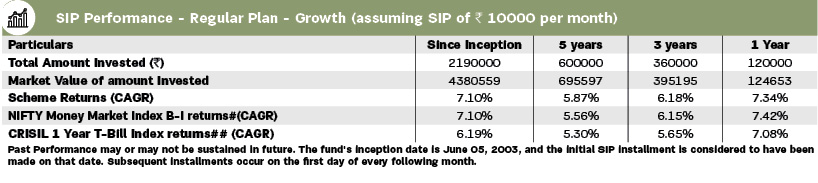 | The primary objective of the scheme is to generate regular income through investment in a portfolio comprising money market instruments. | |