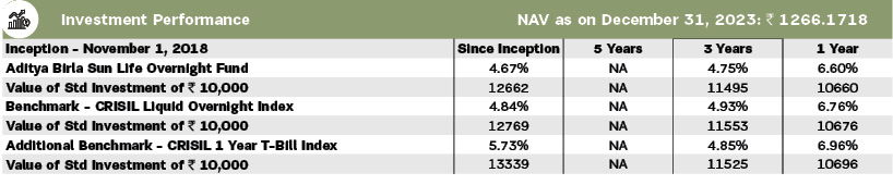 | To generate reasonable income through investments in debt securities, Money Market Instruments & Triparty Repos having maturity of 1 day. The Scheme does not guarantee/indicate any returns. There can be no assurance that the schemes’ objectives will be achieved. |