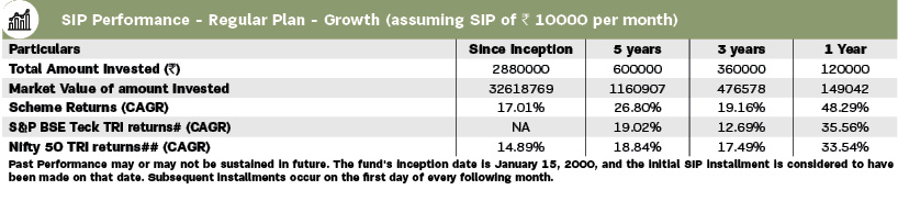 | The primary investment objective of the scheme is to generate long term growth of capital, through a portfolio with a target allocation of 100% equity, focusing on investing in technology and technology dependent companies, hardware, peripherals and components, software, telecom, media, internet and e-commerce and other technology enabled companies. The secondary objective is income generation and distribution of IDCW. | |