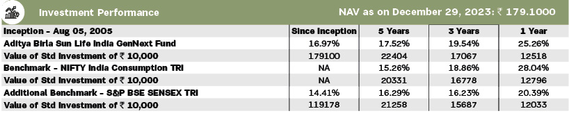 | The objective of the scheme is to target growth of capital by investing in equity/ equity related instruments of companies that are expected to benefit from the rising consumption patterns in India, which in turn is getting fuelled by high disposable incomes of the young generation (Generation Next). The scheme will invest in companies that have the following characteristics: 1. Companies that seek growth in revenues arising out of demand from the younger generation (GenNext) for their products or services. 2. They should be engaged in manufacturing of products or rendering of services that go directly to the consumer. 3. The products and services should have distinct brand identity, thereby enabling choice. | |