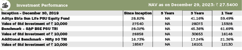 | The investment objective of the scheme is to provide long term capital appreciation by investing in equity and equity related Instruments of Public Sector Undertakings (PSUs). The Scheme does not guarantee/indicate any returns. There can be no assurance that the schemes’ objectives will be achieved. | |