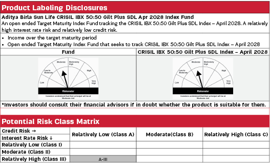 | An open ended Target Maturity Index Fund tracking the CRISIL IBX 50:50 Gilt Plus SDL Index – April 2028.A relatively high interest rate risk and relatively low credit risk. |