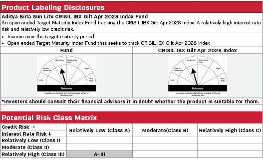 | An open ended Target Maturity Index Fund tracking the CRISIL IBX Gilt Apr 2028 Index. A relatively high interest rate risk and relatively low credit risk. |
