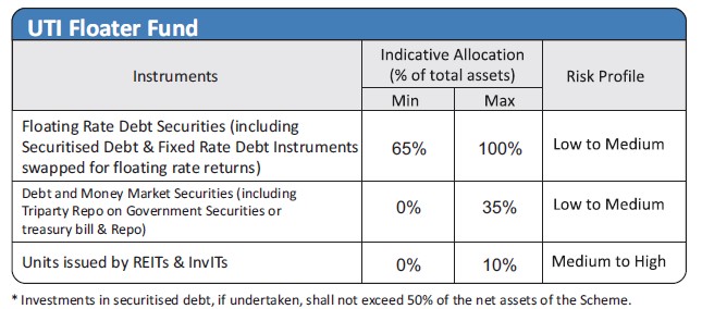 | Investment Objective The investment objective of the scheme is to generate reasonable returns and reduce interest rate risk by investing in a portfolio comprising predominantly of floating rate instruments and fixed rate instruments swapped for floating rate returns. The Scheme may also invest a portion of its net assets in fixed rate debt securities and money market instruments. However there can be no assurance that the investment objective of the Scheme will be achieved. The Scheme does not guarantee / indicate any returns. |