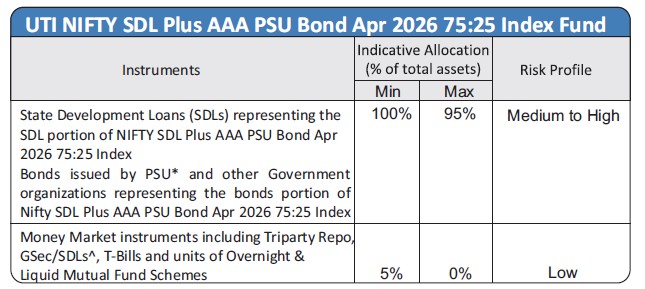 | Investment Objective The investment objective of the scheme is to track the Nifty SDL Plus AAA PSU Bond Apr 2026 75:25 Index by investing in AAA rated PSU Bonds and SDLs, maturing on or before April 2026, subject to tracking errors. However, there is no guarantee or assurance that the investment objective of the scheme will be achieved. |