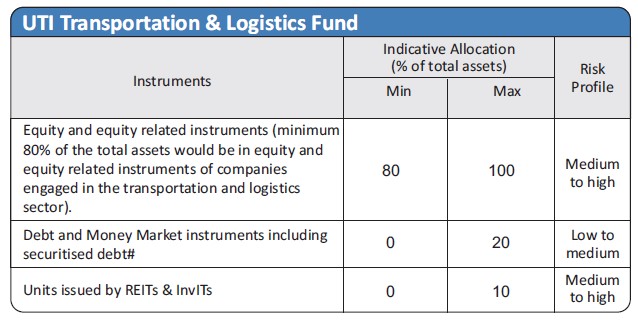 | Investment Objective The objective of the scheme is to generate long term capital appreciation by investing predominantly in equity and equity related securities of companies engaged in the transportation and logistics sector. However, there can be no assurance or guarantee that the investment objective of the scheme would be achieved. |