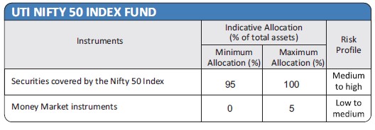 | Investment Objective The principal investment objective of the scheme is to invest in stocks of companies comprising Nifty 50 Index and endeavour to achieve return equivalent to Nifty 50 Index by “passive” investment. However, there can be no assurance or guarantee that the investment objective of the scheme would be achieved. |